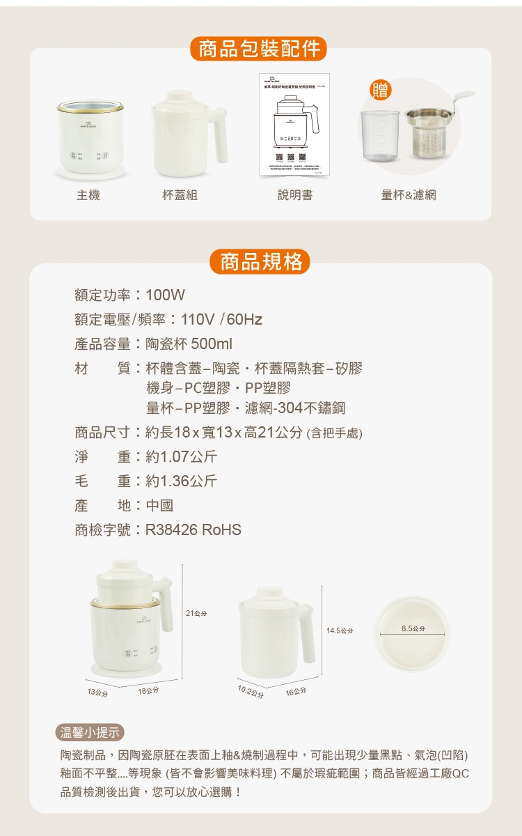 內 容 物:主機x1、陶瓷杯蓋(含矽膠隔熱套)x2、不鏽鋼濾網x1、塑膠量杯x1、產品使用說明書(內含保固卡)x1