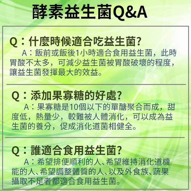 什麼時候適合吃益生菌? 飯前或飯後1小時適合食用益生菌 添加果寡糖的好處? 果寡糖是10個以下的單醣聚合而成,甜度低,熱量少