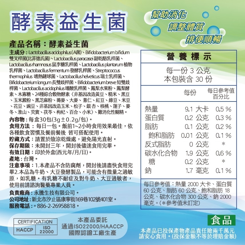 主成分:Lactobacillus acidophilus(A菌)、Bifidobacterium bifidum 雙叉桿菌(比菲德氏菌)、Lactobacillus paracasei 副乾酪乳桿菌、Lactobacillus rhamnosus 鼠李糖乳桿菌、Lactobacillus plantarum 植物乳桿菌、Lactobacillus fermentum 發酵乳桿菌、Streptococcus thermophilus 嗜熱鏈球菌、Lactobacillus helveticus 瑞士乳桿菌、Bifidobacterium longum 長雙歧桿菌、Bifidobacterium breve 短雙歧桿菌、Lactobacillus acidophilus 嗜酸乳桿菌、鳳梨水果粉,鳳梨酵素,木寡糖,24種綜合穀物酵素〈非基因改造黃豆、糙米、黑豆、玉米澱粉、黑芝麻粉、蕎麥、大麥、 薏仁、紅豆、綠豆、米豆、花豆、豌豆、非基因改造玉米、松子、銀 杏、核桃、蓮子、麥冬、淮山、芡實、茯苓、枸杞、百合、小米〉、難消化性糊精。