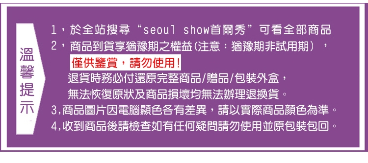 2,收到商品後請檢查如有任何疑問請不要使用(原包裝包回),商品到貨享猶豫期之權益(注意!猶豫期非試用期,僅供鑒賞請勿使用!)