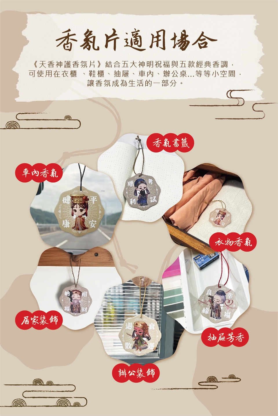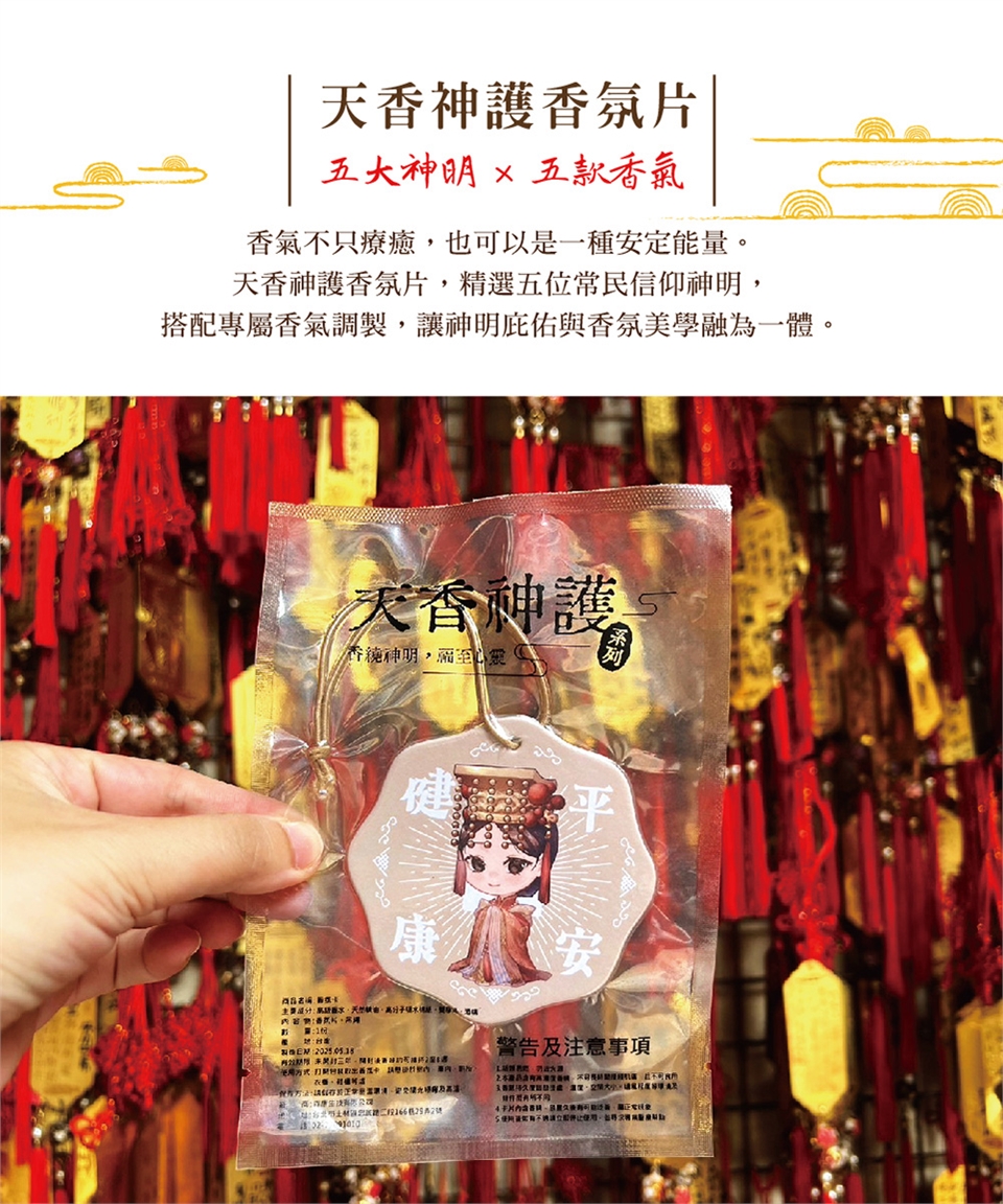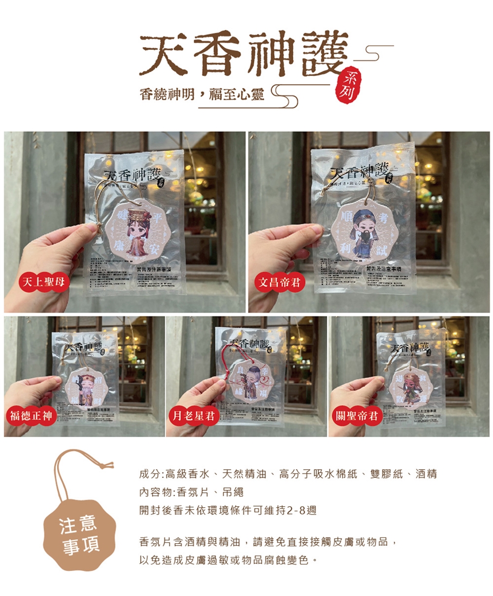 《天香神護香氛片》結合五大神明祝福與五款經典香調,可使用在衣櫃 、鞋櫃、抽屜、車內、辦公桌…等等小空間,讓香氛成為生活的一部分。