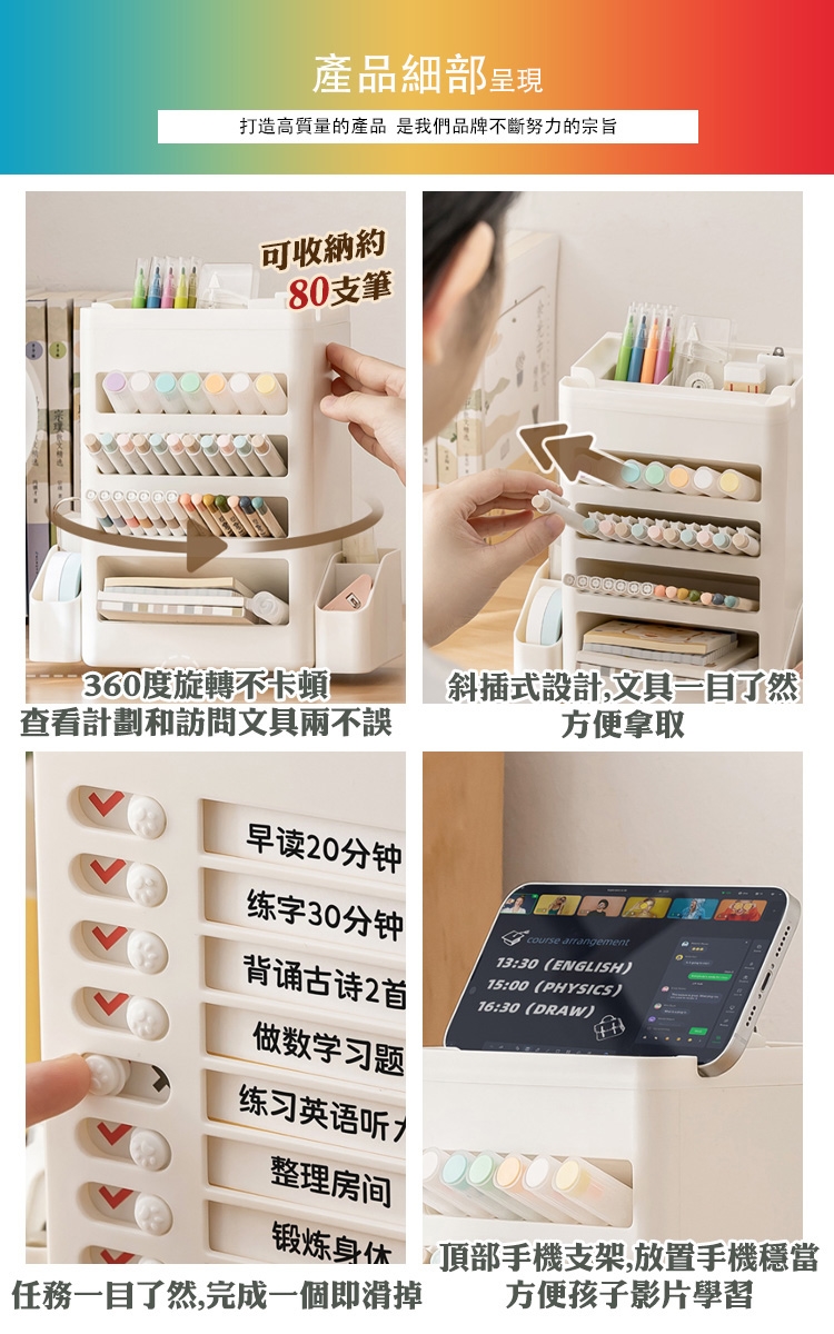 它的底座可旋轉,方便查看不同部位的收納筆筒與自律任務。