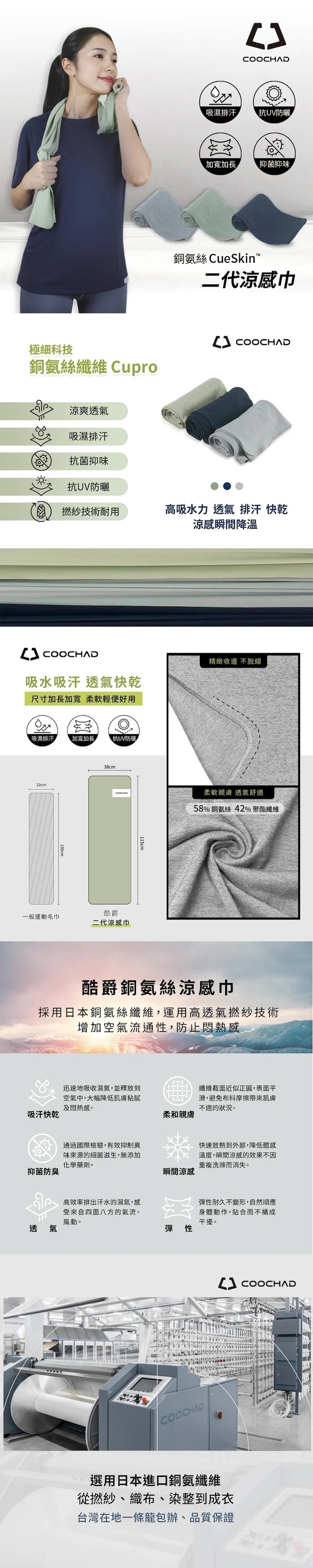 採用極超細科技銅氨絲纖維 Cupro, 具備高吸水力且又透氣排汗快乾,涼爽瞬間降溫,減少出汗發熱的不適感。