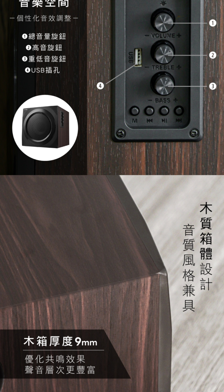 ★ 多功能旋鈕設計,輕鬆調節音量、高音與低音,音效由你掌控