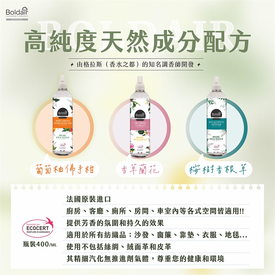 【BOLDAIR 新鮮空氣】空氣紡織品淨化噴霧 葡萄柚佛手柑香氣 400ML,法國原裝進口,高純度天然成分配方,放置在廚房、客廳、廁所、房間、車室內等各式空間皆適用,以探索大自然為靈感的全新 BOLDAIR 新鮮空氣"Échappée Verte"系列!