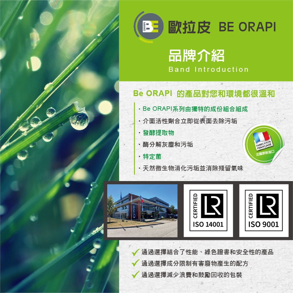 產品中所含的酵素能有效地分解異味來源及產生有益細菌,能長時間防止在處理過的表面上再形成新的異味。非常適合處理浴室、小便池、廁所或任何其它容易弄髒之地方的難聞氣味。