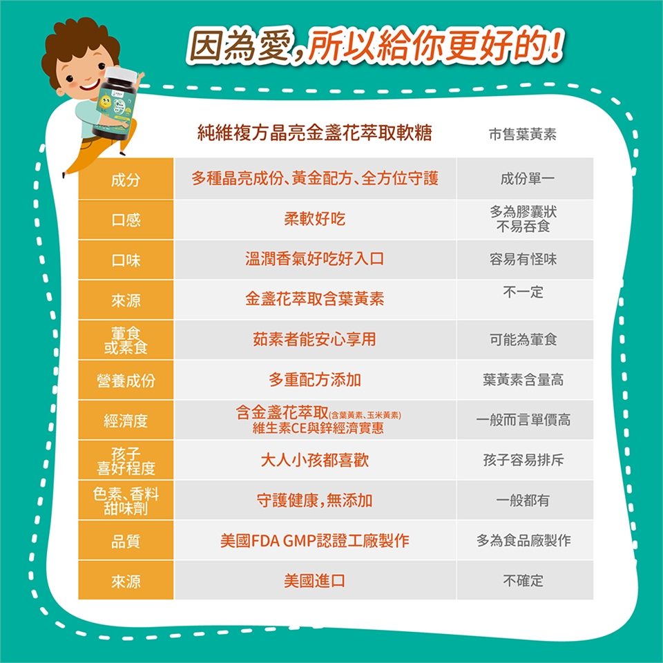 2. 添加了金盞花萃取(含葉黃素與玉米黃素)、維生素C&E、鋅!