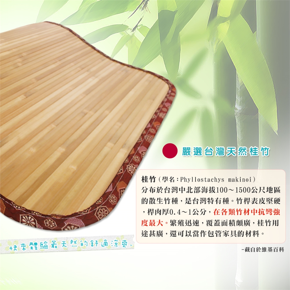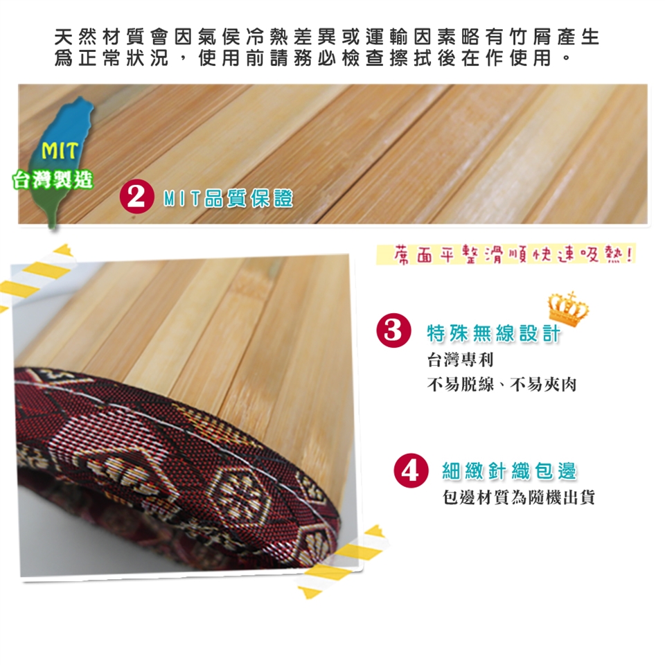 本商品具有台灣專利的無線設計,不脫線不易夾肉,平整的竹蓆表面,更快速吸收身體熱度,馬上使用,馬上冰涼!台灣製造天然竹蓆是您在選擇天然竹片蓆時最滿意的好選擇喔!