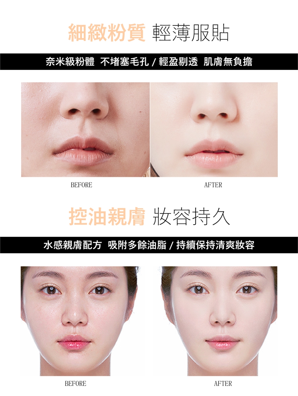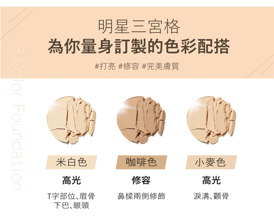粉底液/氣墊粉餅之後,先用粉撲混搭三色,可創造輕盈無暇妝感,接著用粉刷沾取中層色,打造小臉陰影,用上層色,刷亮眼周盒T字部位提亮輪廓。