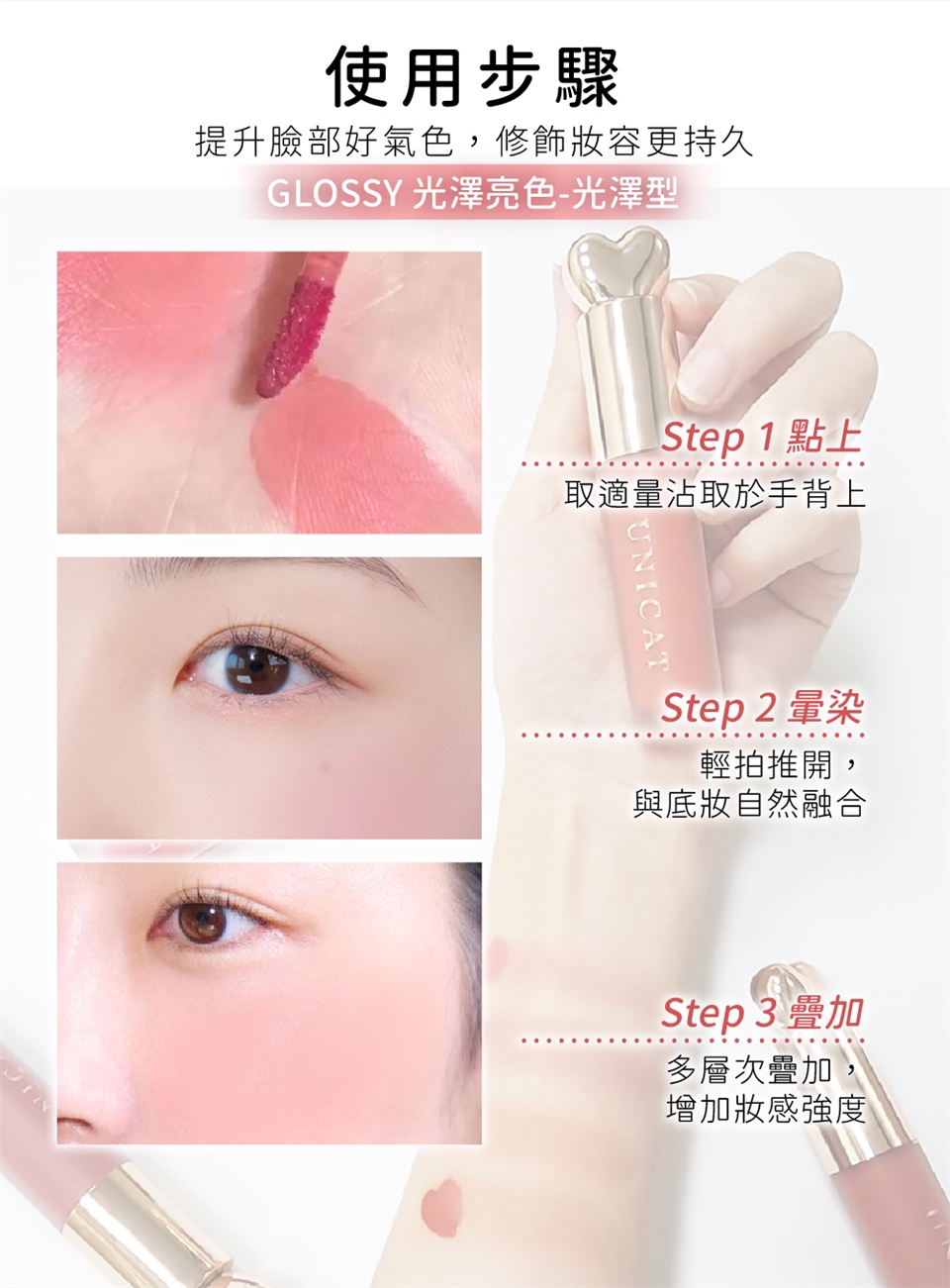 取適量塗抹於臉頰顴骨處,利用指腹以輕拍的方式