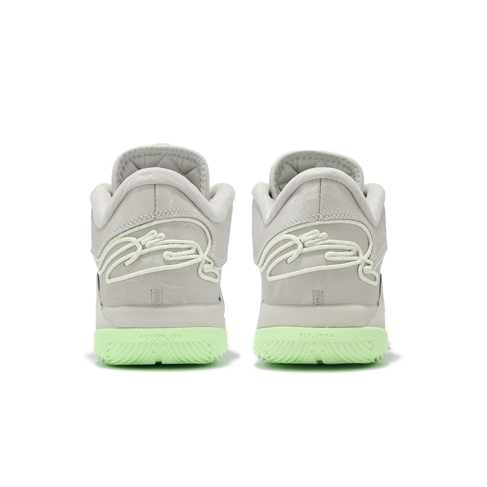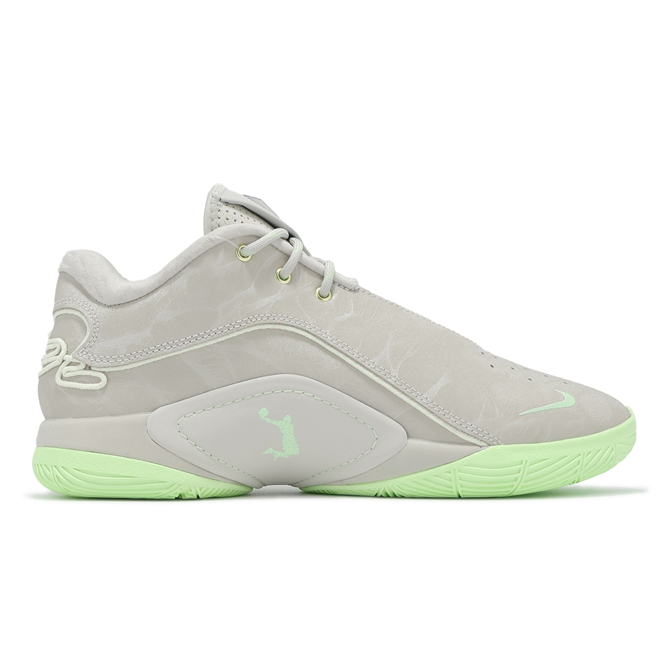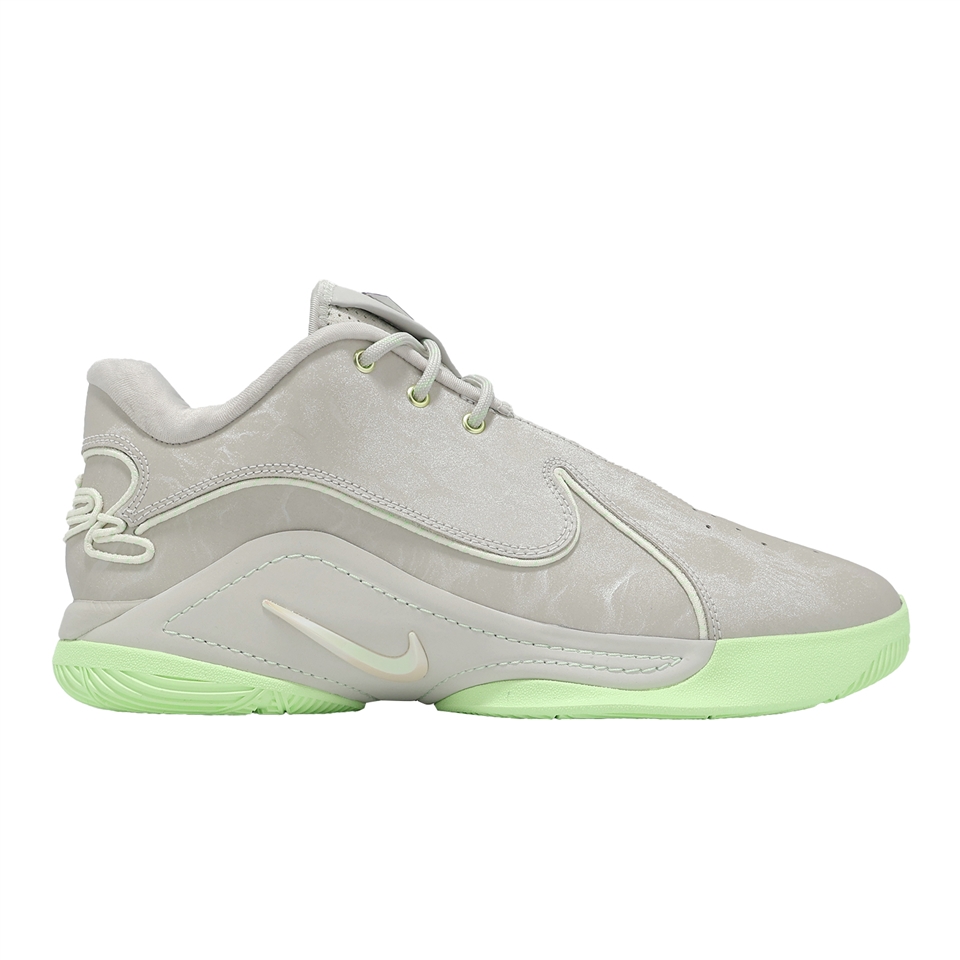 * 整體鞋身以灰色為主調,輔以亮綠色搭配,鞋面還似有水波紋的紋路,此次以耐磨橡膠大底作為搭配,整體低調且強大的奢華質感與國王之名相互匹配;鞋身內側繡有少見 Nike 的 Dunkman 的Logo,象徵LeBron在場上的無懈可擊。