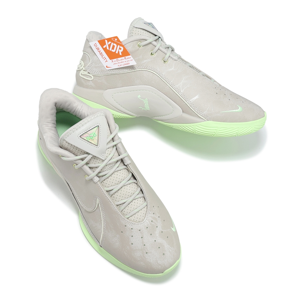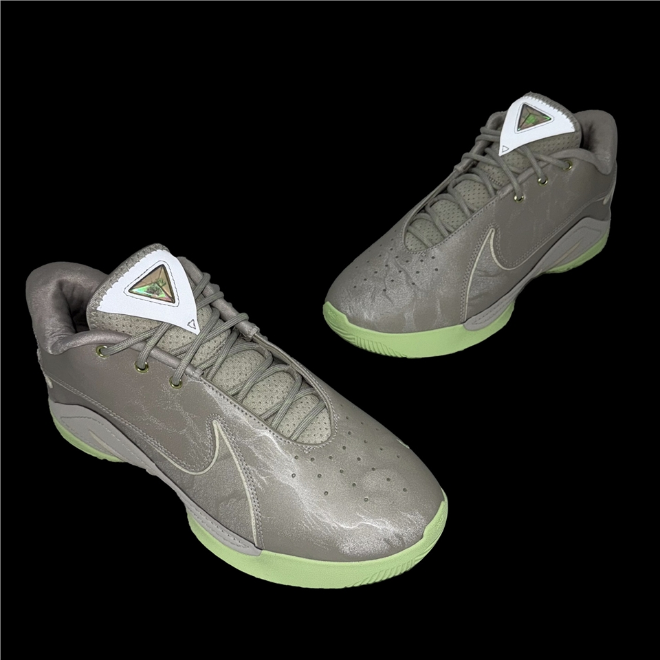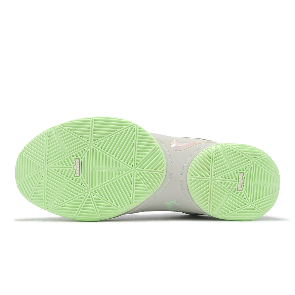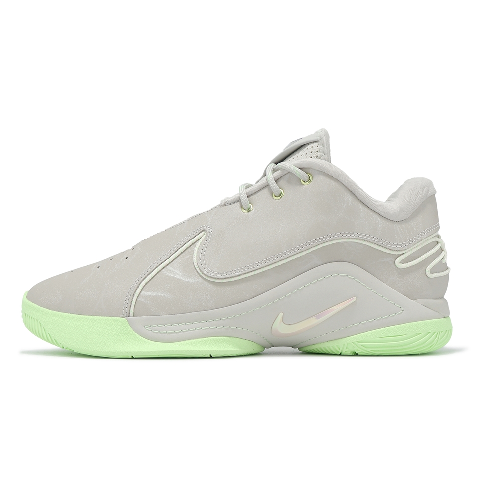 * 整體鞋身以灰色為主調,輔以亮綠色搭配,鞋面還似有水波紋的紋路,此次以耐磨橡膠大底作為搭配,整體低調且強大的奢華質感與國王之名相互匹配;鞋身內側繡有少見 Nike 的 Dunkman 的Logo,象徵LeBron在場上的無懈可擊。