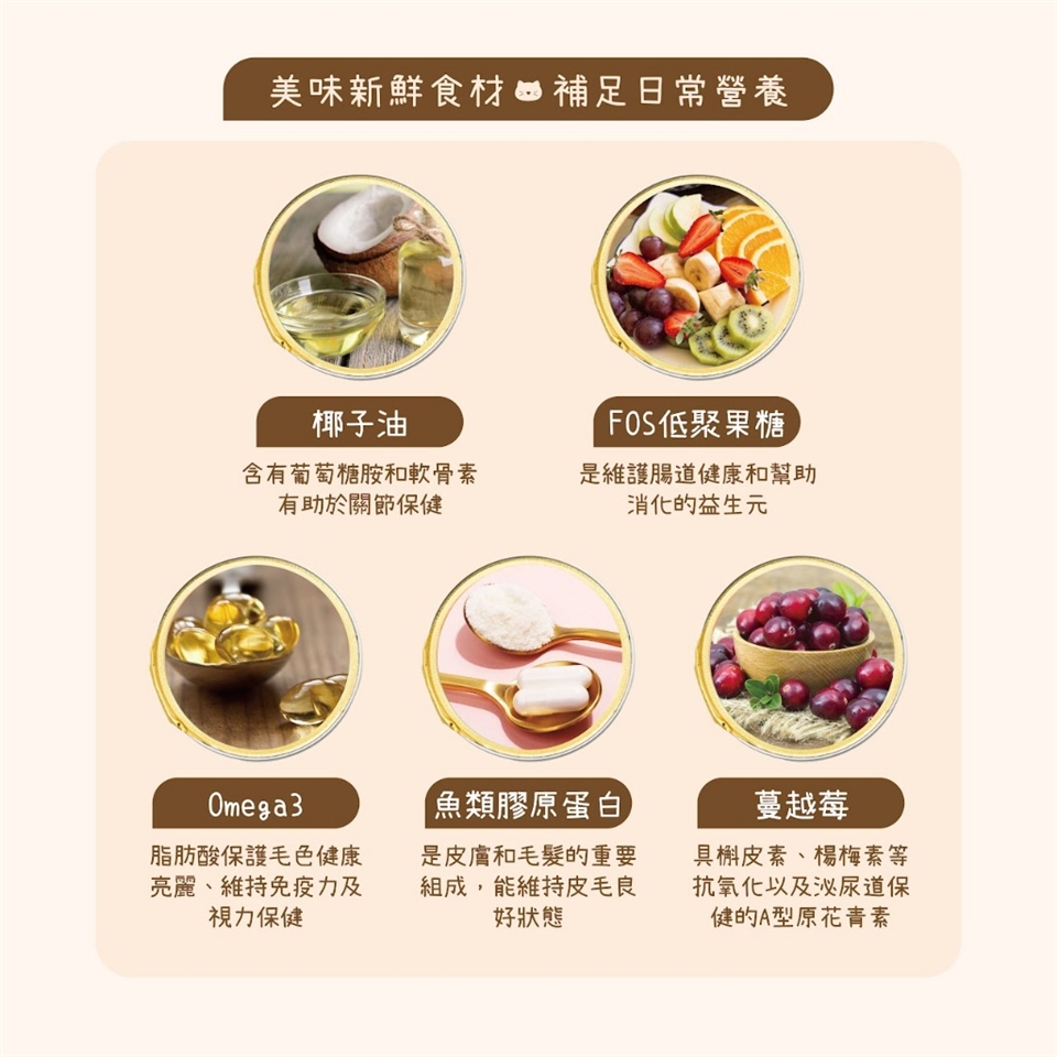 主成份:鮪魚、蟹肉、Omega 3、魚類膠原蛋白、綜合維生素(B、C、D、E)、多種礦物質、寒天、牛磺酸