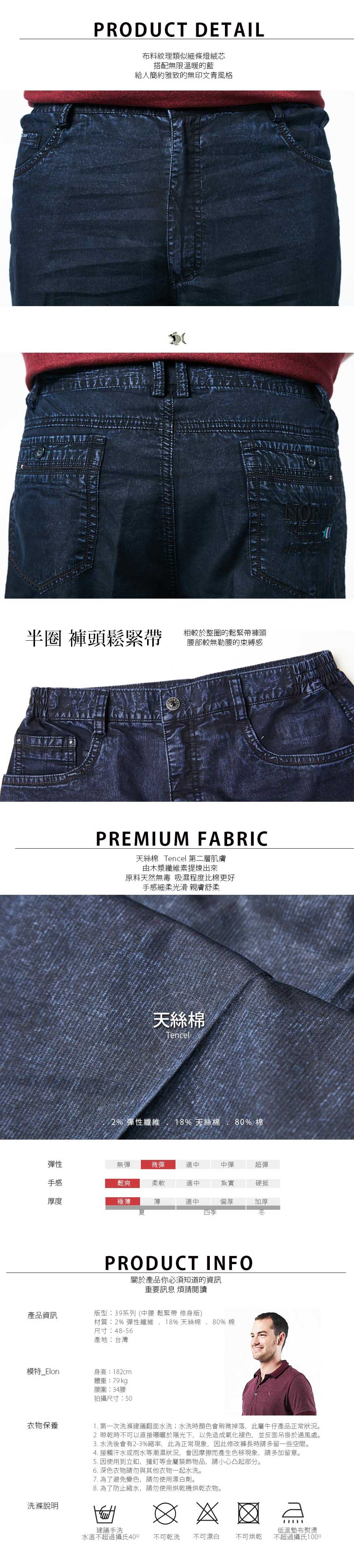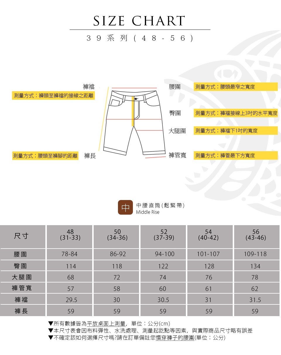 E.水洗後會有2-3%縮率,此為正 常現象,在修改褲長時請稍微增長褲長;此外,為了防止縮水,請勿使用烘乾機烘乾衣物。