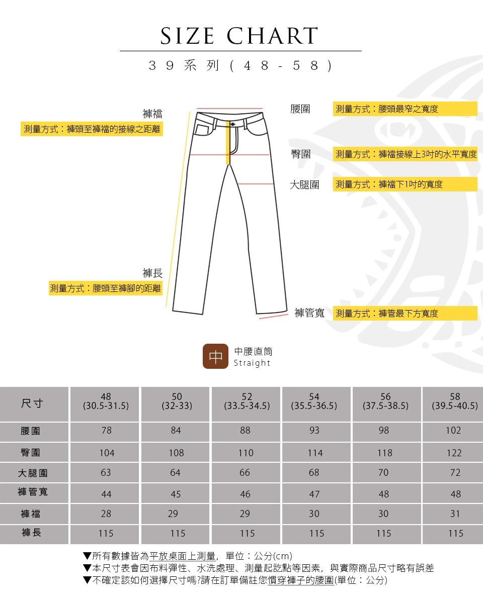 E.水洗後會有2-3%縮率,此為正 常現象,在修改褲長時請稍微增長褲長;此外,為了防止縮水,請勿使用烘乾機烘乾衣物。