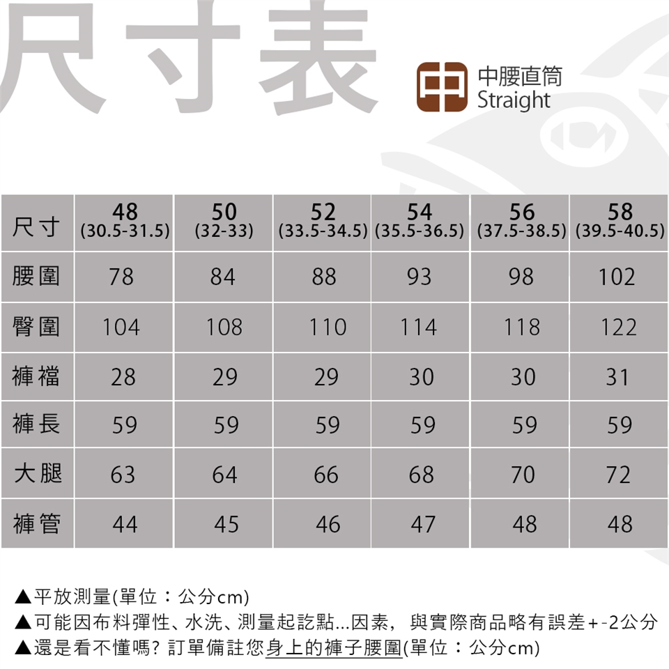 E.水洗後會有2-3%縮率,此為正 常現象,在修改褲長時請稍微增長褲長;此外,為了防止縮水,請勿使用烘乾機烘乾衣物。