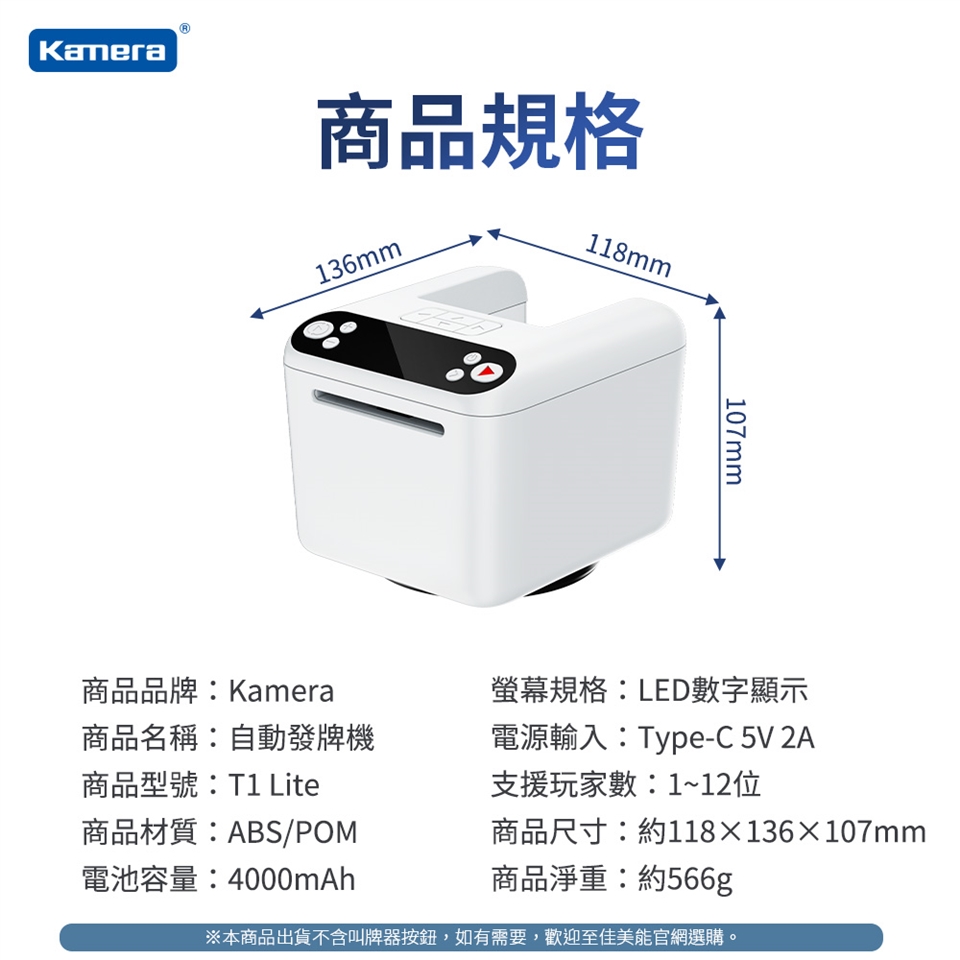 螢幕規格:LED數字顯示 電源輸入:Type-C 5V 2A 支援玩家數:1~12位(均分發牌模式)