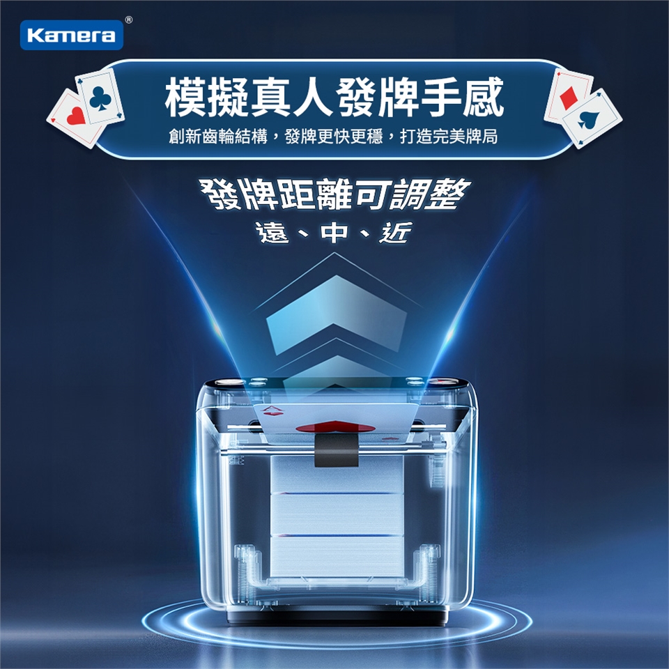 - 模擬真人發牌手感,可調整發牌距離:遠/中/近,創新齒輪結構,發牌更快更穩,打造完美牌局