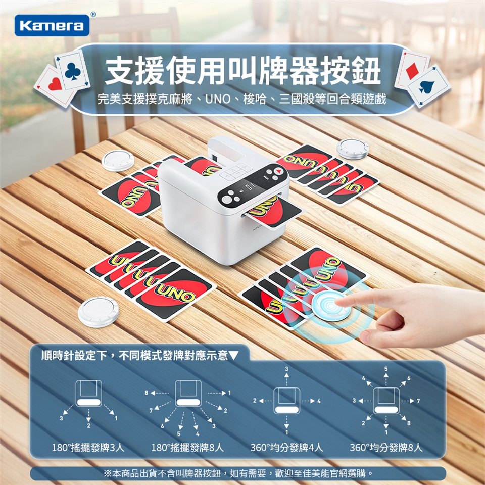 - 發牌不再手抽筋,簡化遊戲準備時間,闔家歡樂新選擇