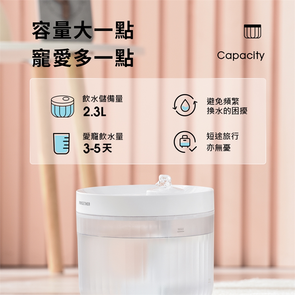特色:湧泉式出水,保持活水流動供給;三重循環過濾,淨化改善水質;USB式接口,多種供電選擇,活水時刻供應,5V低壓電馬達,免受噪音困擾;磨砂透身機身,簡約質感,剩餘水量一目瞭然,缺水斷電保護避免馬達空燒。