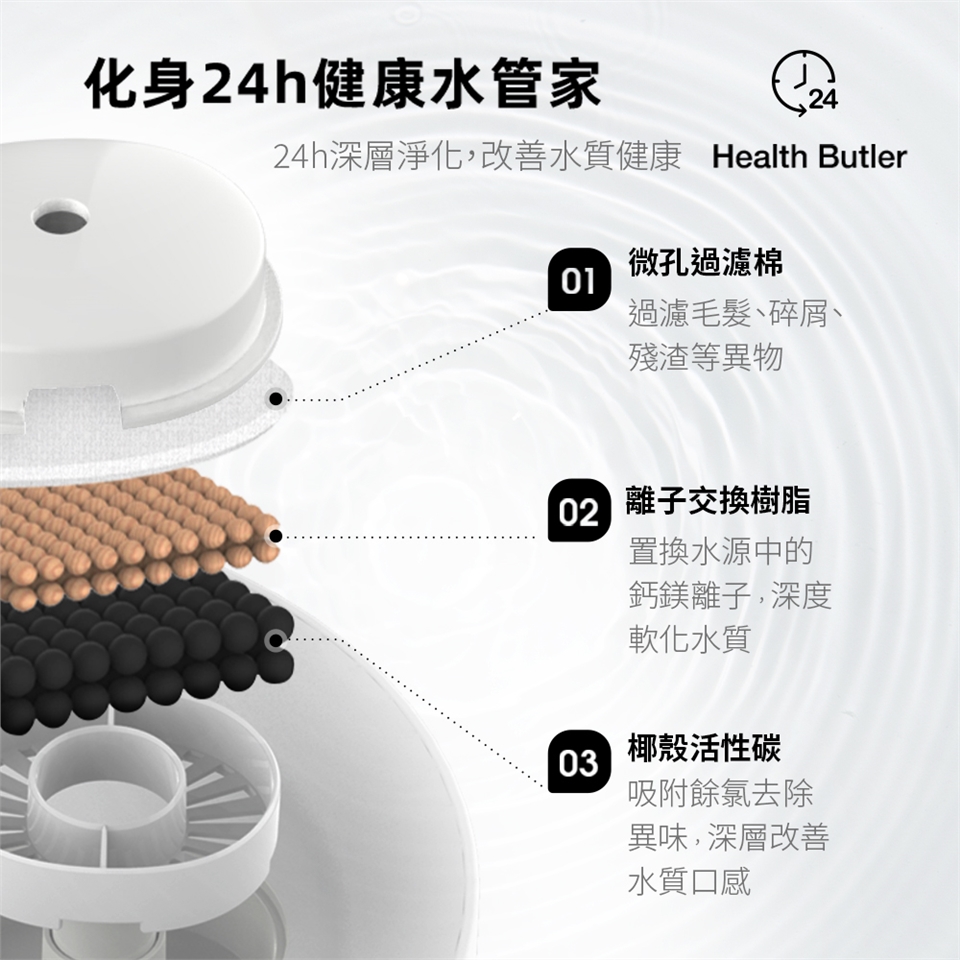 材質 : ABS、沉水馬達、過濾棉、活性碳、離子交換樹脂