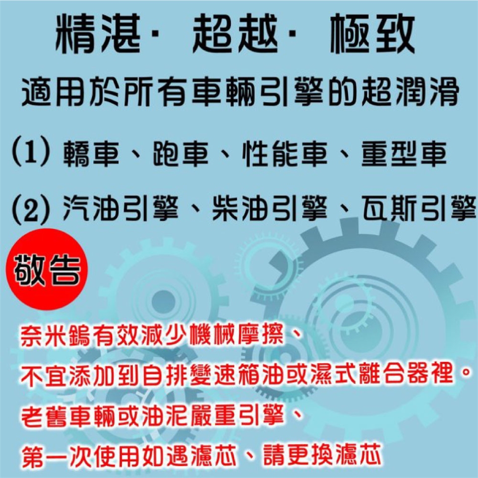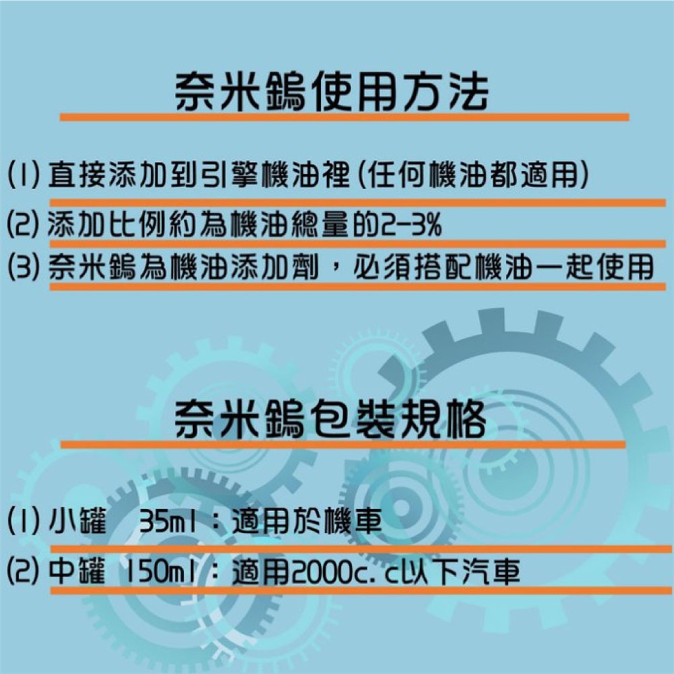 卡車、商用車,請按照引擎機油比例添加3% 奈米鎢