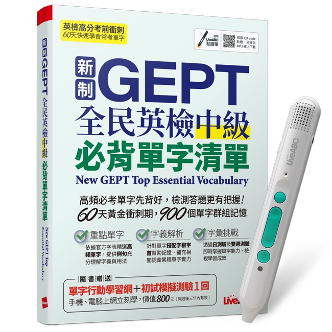 大多數人都希望單字能背得快、記得牢,而為了準備考試的讀者更希望能在有限的時間達到最大的效益,然而,根據大多數人的經驗,單字硬背而不知道如何正確使用,往往也會忘得快。因此,我們製作了這本《新制GEPT全民英檢中級必背單字清單》,希望所提供的各種學習模式,可以幫助每一位應試者解決背單字的難題。