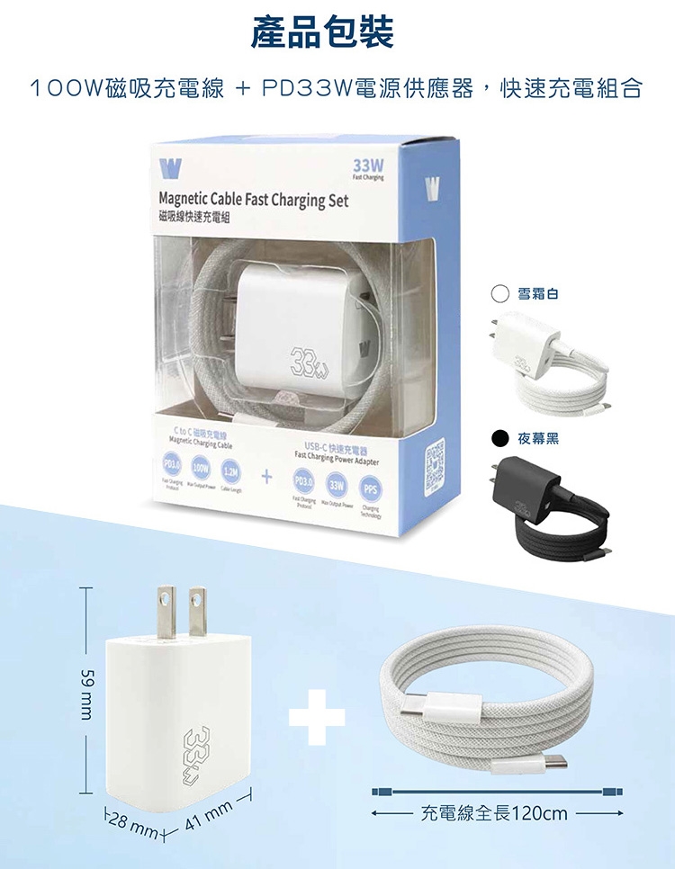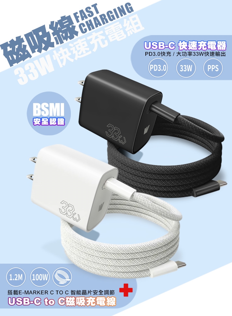 Wephone PD33W單孔+100W Type-C to Type-C磁吸線快速充電組