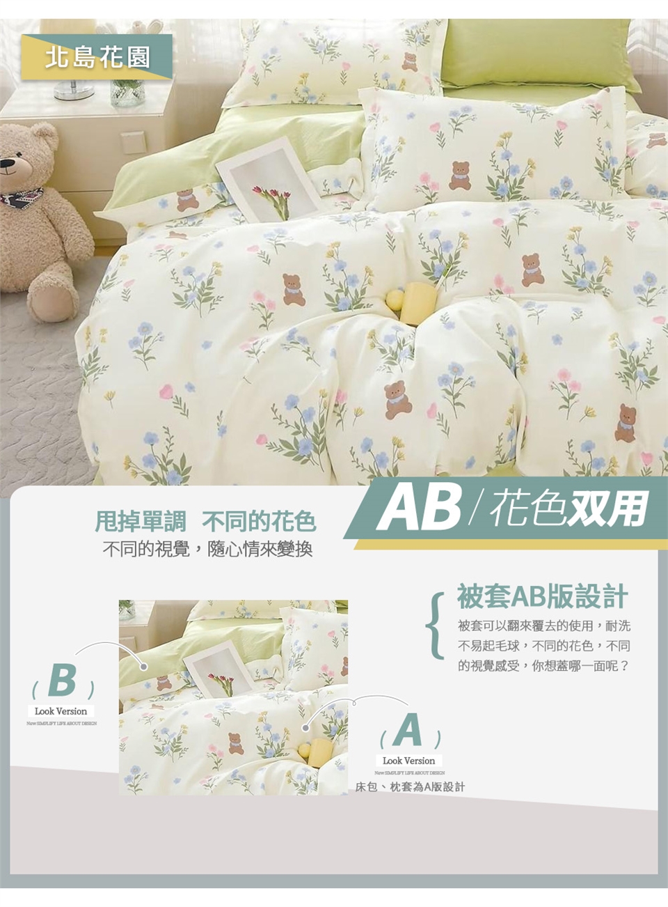 貼心小提醒02-花色為隨機裁切,以實際收到的花色為主(床包、枕套為A版,被套為AB版)