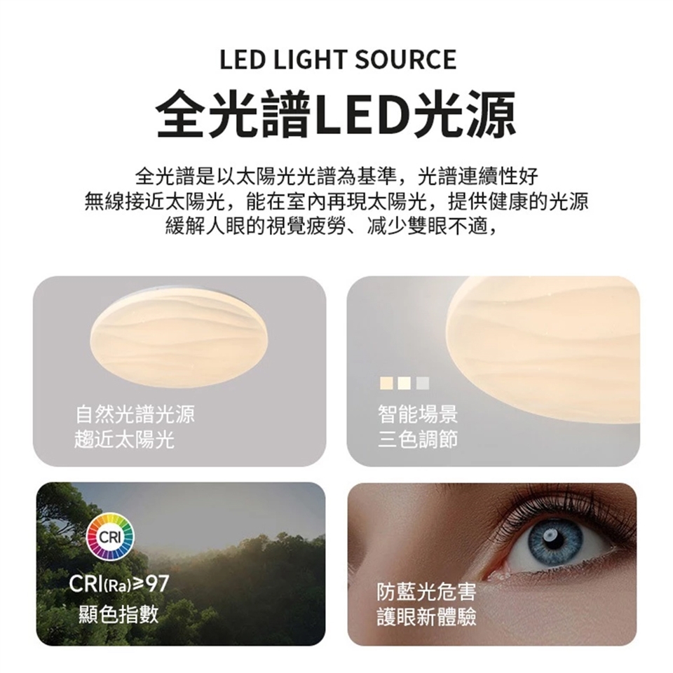 這款燈採用高顯色晶片,全光譜護眼光Ra≥97,能夠提供生動自然的光照,高度還原物體的色彩。