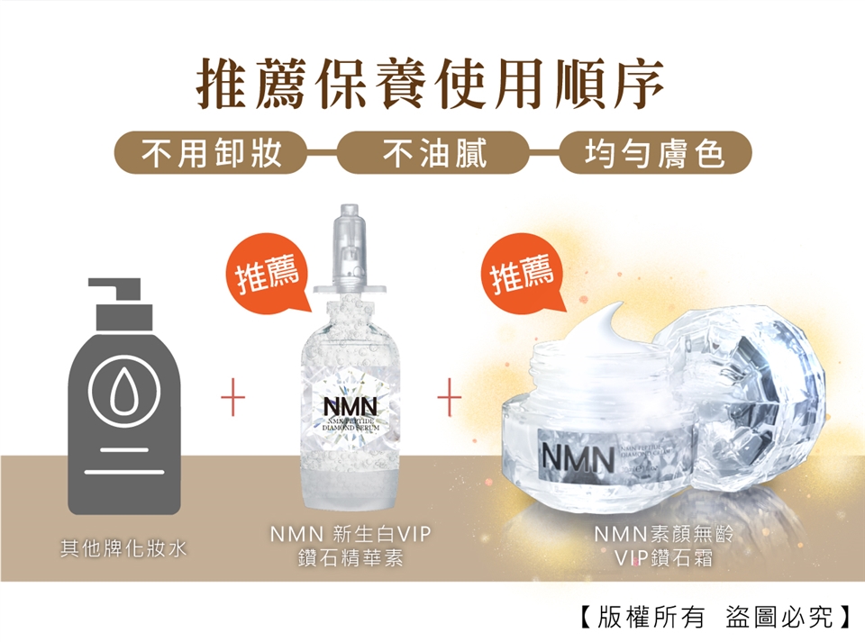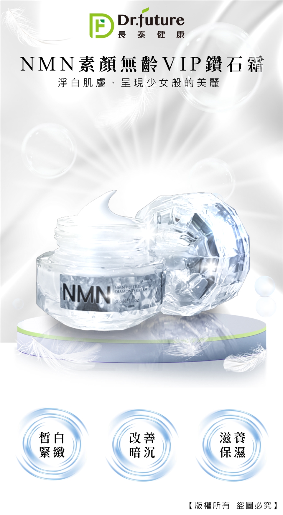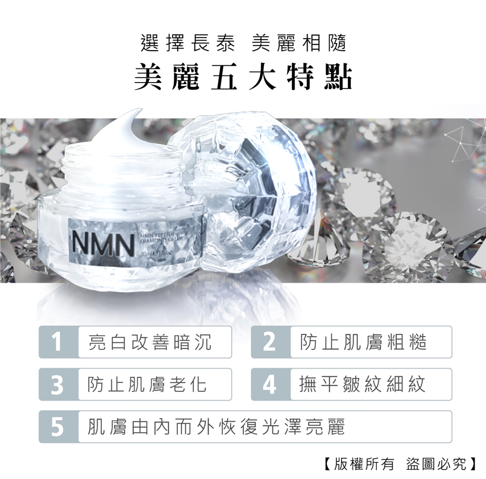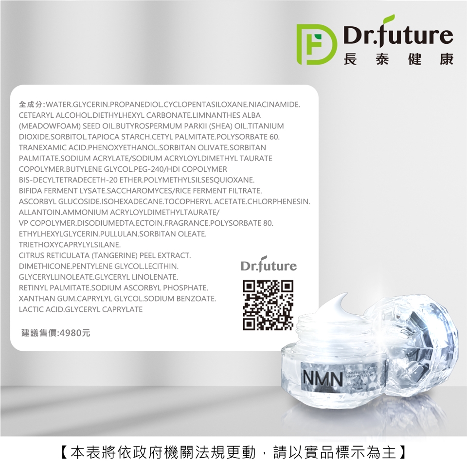主商品:Dr.future長泰健康NMN素顏無齡VIP鑽石霜(30ml/瓶)*5(此商品開放體驗數量,退貨時需退回;其餘商品須保持包裝完整,以免影響退換貨權益)
