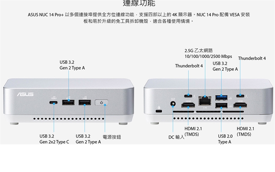 | 介面 | 前(側)置: 1 x USB 3.2 Gen2x2 Type C 2 x USB 3.2 Gen2 Type A 後置: 1 x 2.0 Type-A 2 x HDMI 2.1 (TMDS) ports 1 x RJ45 LAN Port 1 x DC-in 1 x Kensington Lock |