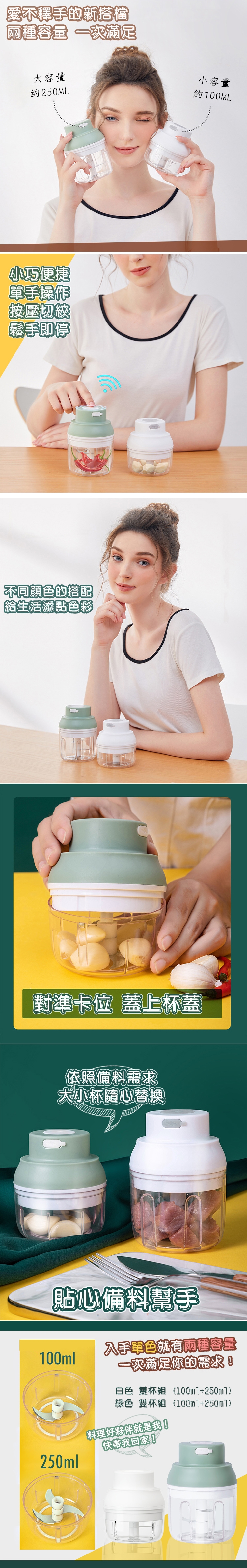 包裝內容:主機、USB充電線、說明書、100ML杯+2刀片、250ML杯+3刀片