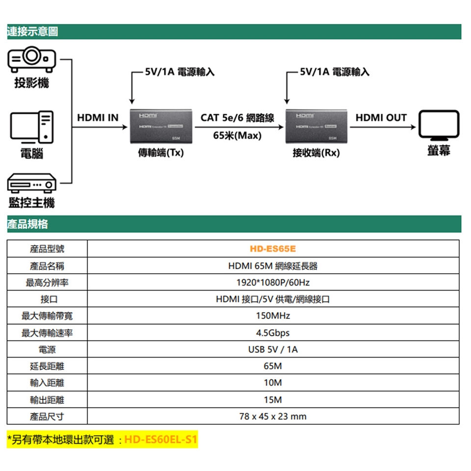 - HDMI 高清傳輸距離 65M,單網線傳輸。