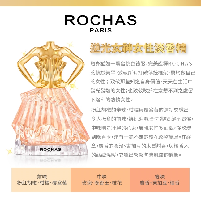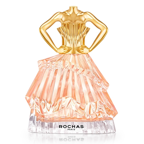 瓶蓋設計如緊身上衣,象徵一位準備贏得賽事的果敢女性,同時展現女性的感性與柔美。瓶身猶如一襲蜜桃色禮服,完美詮釋ROCHAS品牌的精緻美學。