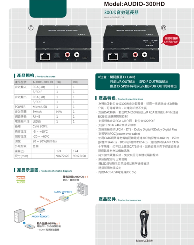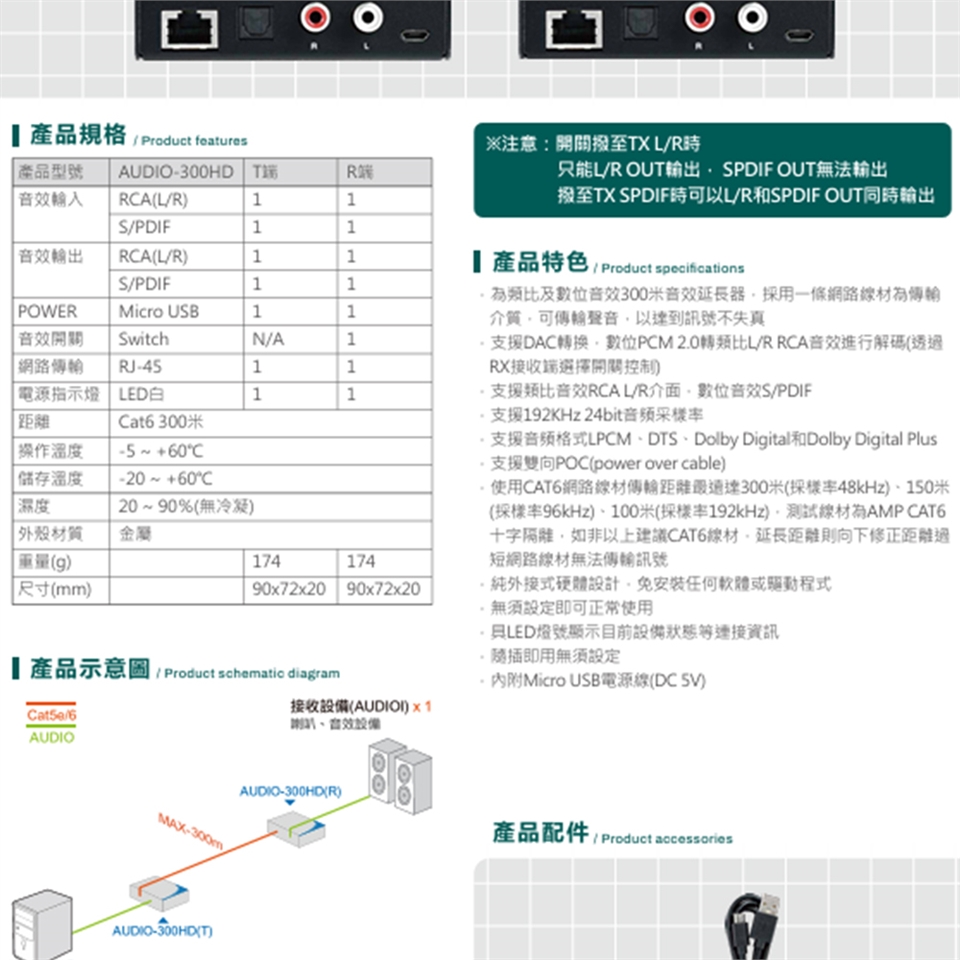​​​-為類比及數位音效300米音效延長器,採用一條網路線材為傳輸介質,可傳輸聲音,以達到訊號不失真