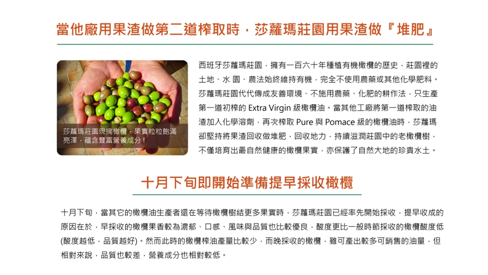 產自百年獨立的自家莊園橄欖,摒除混雜其他產地或品種的橄欖