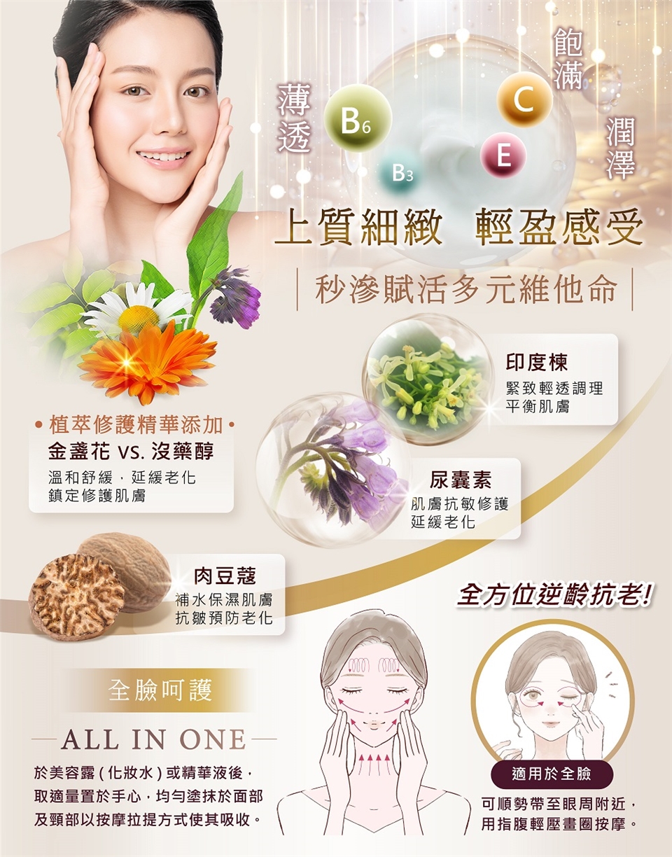 用法:於美容露(化妝水)後取適量並輕柔均勻塗抹按摩於臉、頸部即可。