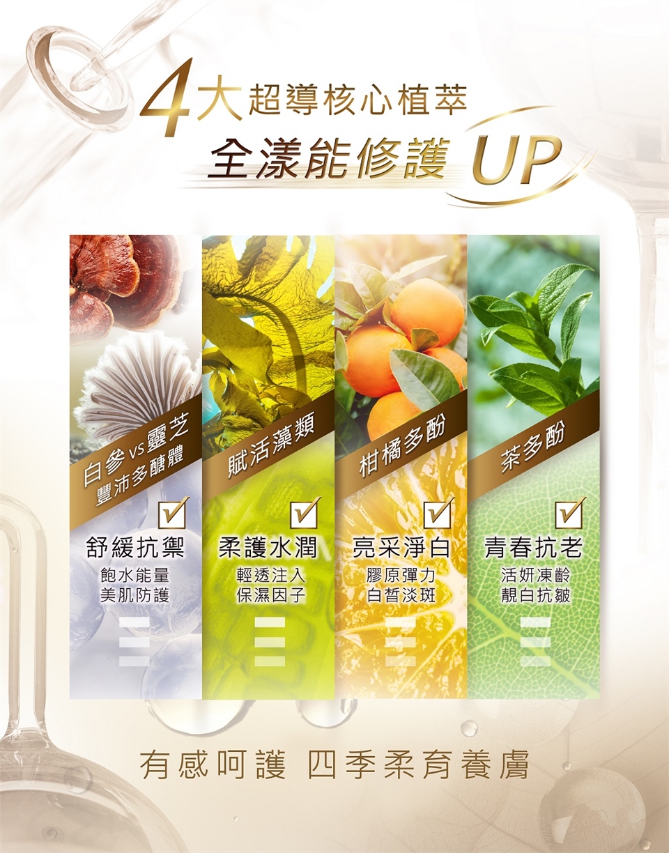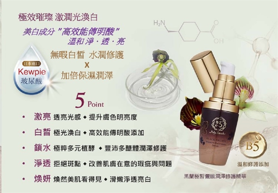 用途:高貴黑蘭精萃搭配柑橘多酚、生川蓮萃取及傳明酸、榆繡線菊花和印度楝成分,能極佳滋養、白皙肌膚,並提升保濕力、補水鎖水,呵護肌膚亮白水嫩,彈力豐潤。使肌膚光采亮澤緊緻抗皺。