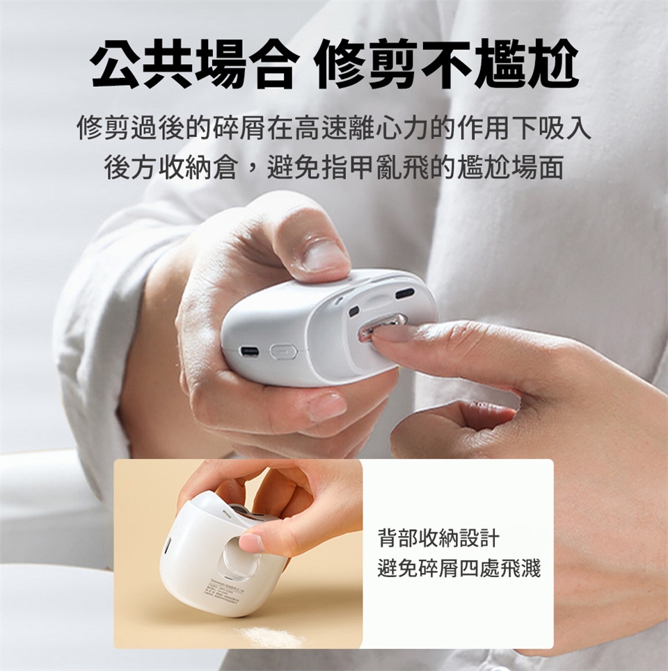 內容物:電動指甲剪主機 x1、Type-C充電線 x1、說明書 x1