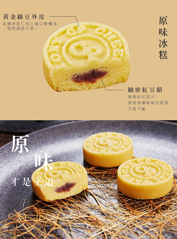 黃金綠豆外皮嚴選綠豆仁加入進口橄欖油,造就綿密口感,內餡是細緻的紅豆沙,使用海藻糖降低甜度,不甜不膩。