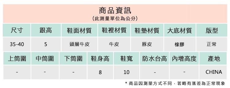 2.鞋類商品依功能及用途之不同,鞋底各有其止滑係數之個別不同,使用鞋類商品請用於正常平坦之路面,非雨鞋或雨靴類商品,請避免穿著於下雨濕滑路面上行走。