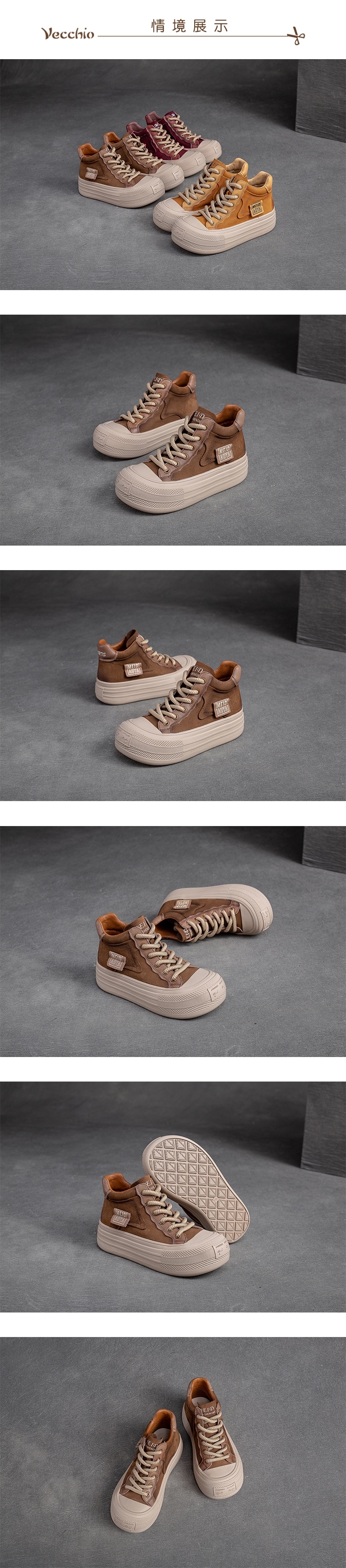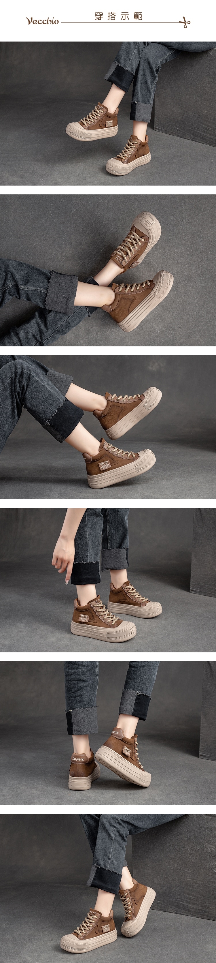 【VECCHIO】全真皮厚底休閒鞋/全真皮頭層牛皮個性貼標繫帶厚底休閒鞋 女鞋 棕