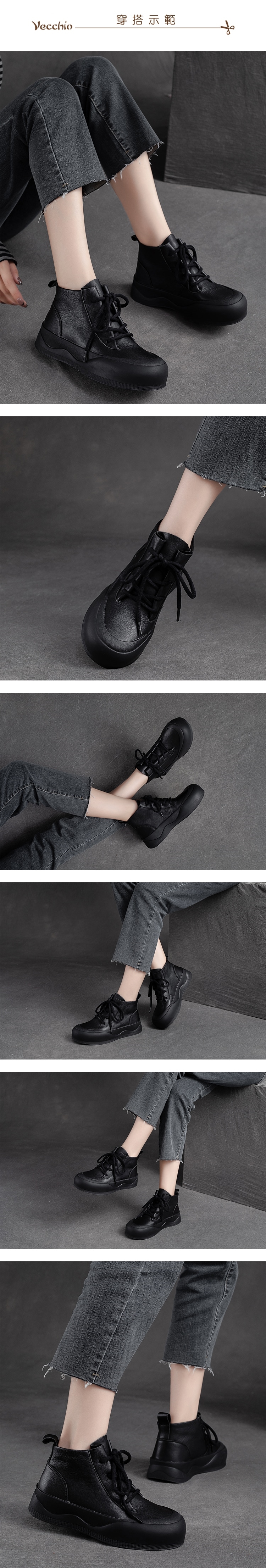 【VECCHIO】全真皮厚底短靴/全真皮頭層牛皮經典繫帶厚底百搭短靴 女鞋 黑