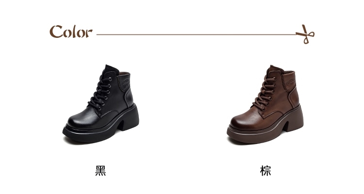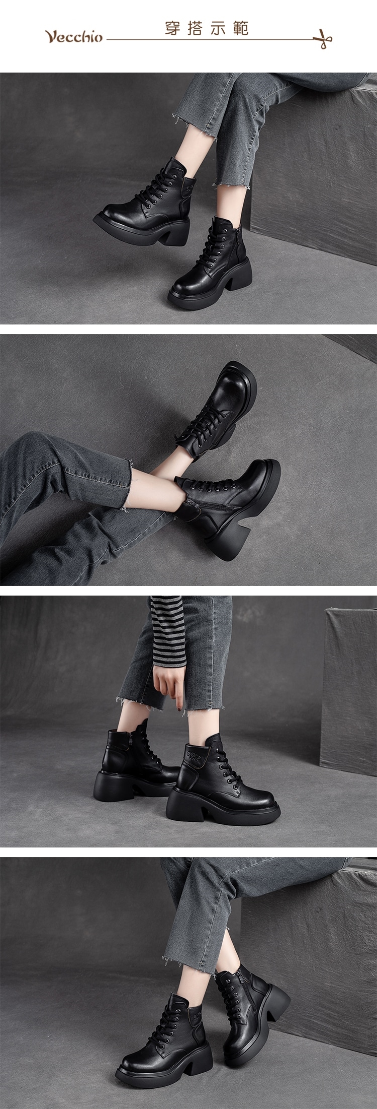 【VECCHIO】全真皮翻領粗跟厚底短靴/全真皮頭層牛皮復古小翻領繫帶粗跟厚底短靴 女鞋 黑