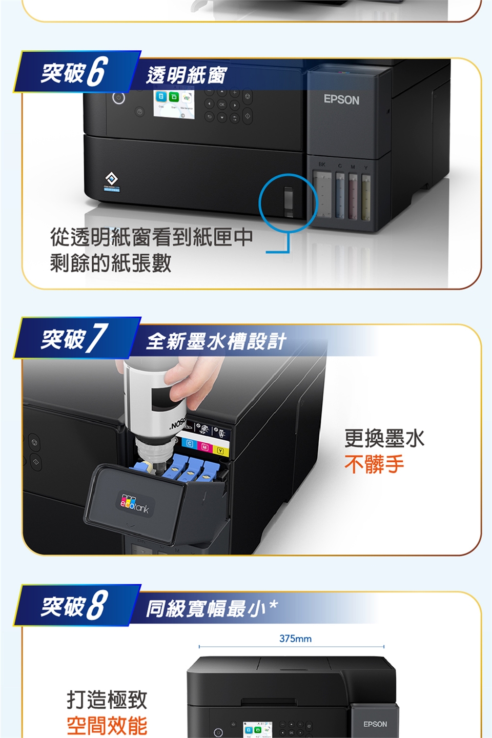 Epson L6370內建全新又便利的自動雙面掃描/影印功能,另搭配防水墨水、自動文件進紙匣,讓您能有效進行多頁/雙面處理,不僅環保更節省寶貴時間。