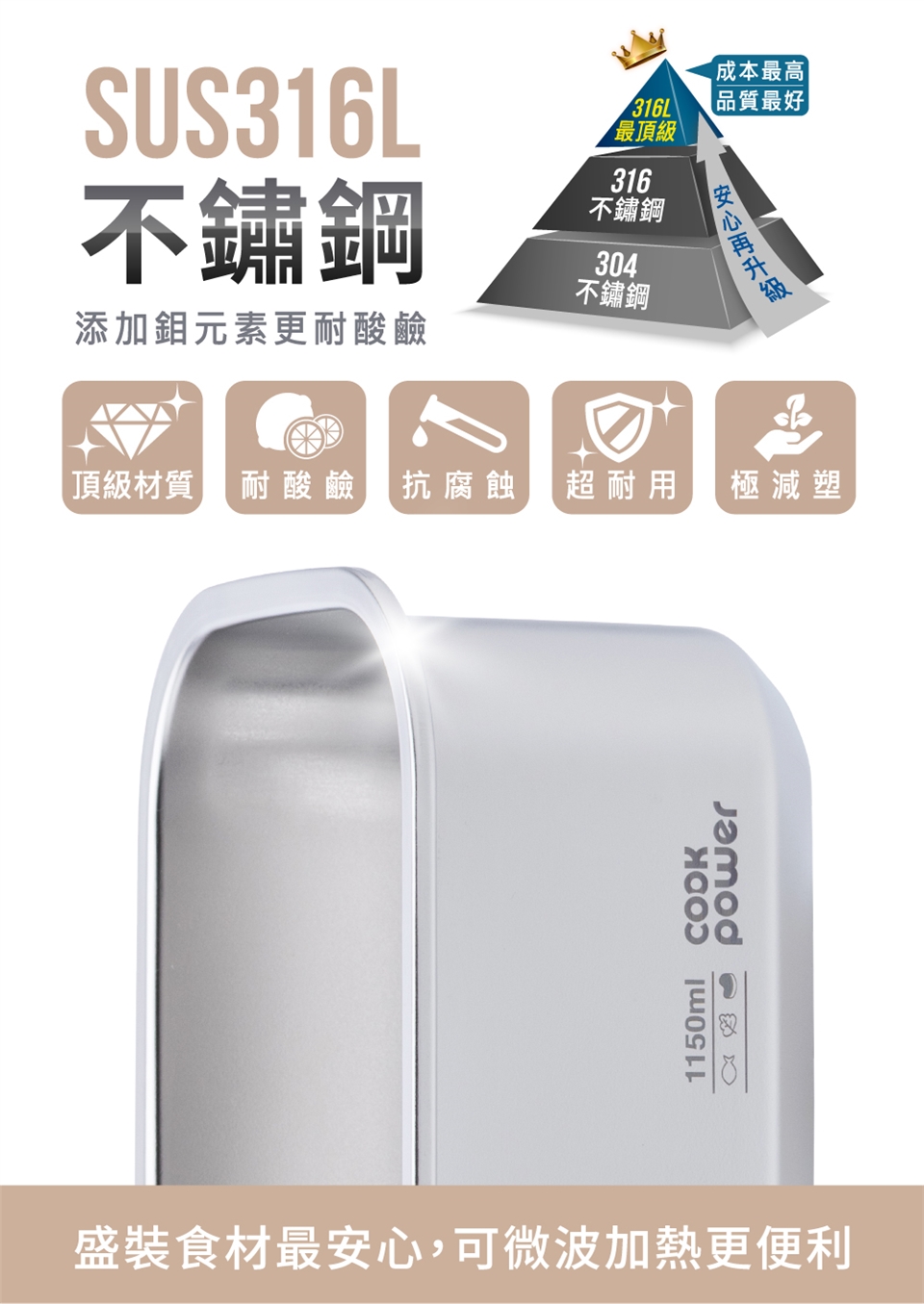 【CookPower 鍋寶】Snapiro可微波316L不鏽鋼保鮮盒1400ml(麥穗米)