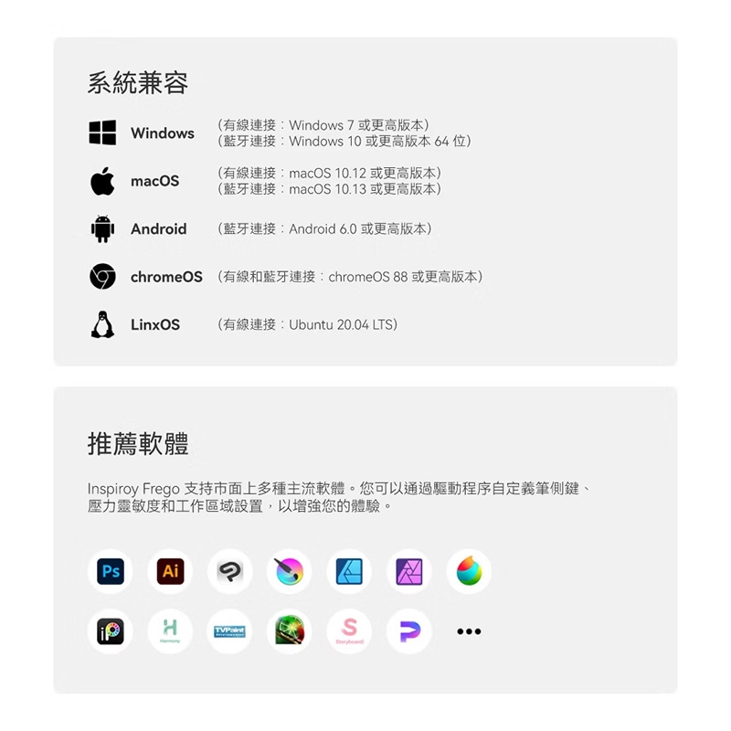 Inspiroy Frego M繪圖板、PW550S數位筆、USB-C連接線、標準筆芯PN06*10、安裝手冊