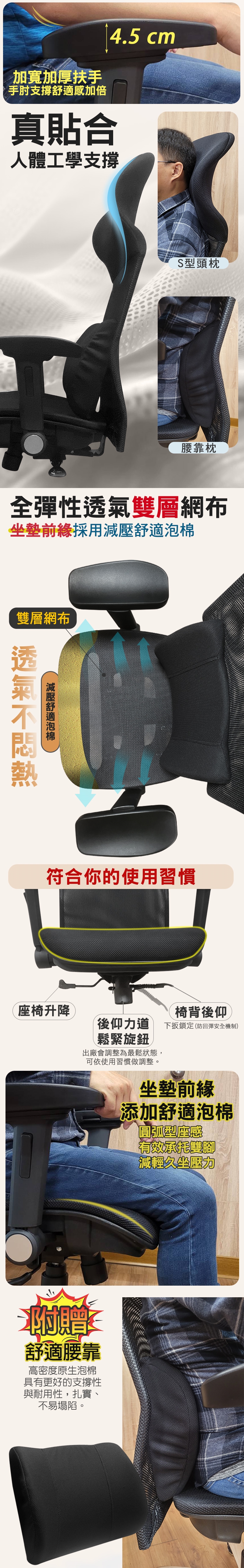 4.5公分厚PU軟質加寬加厚5D扶手,手肘支撐舒適感加倍