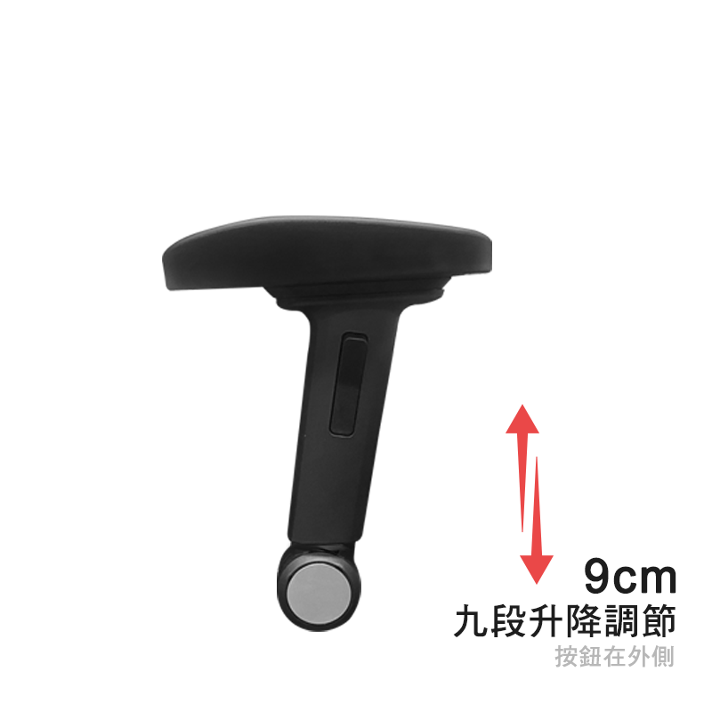 扶手可進行九段高度調整,輕鬆對應不同坐姿與桌面高度,讓手臂支撐更自然舒適。